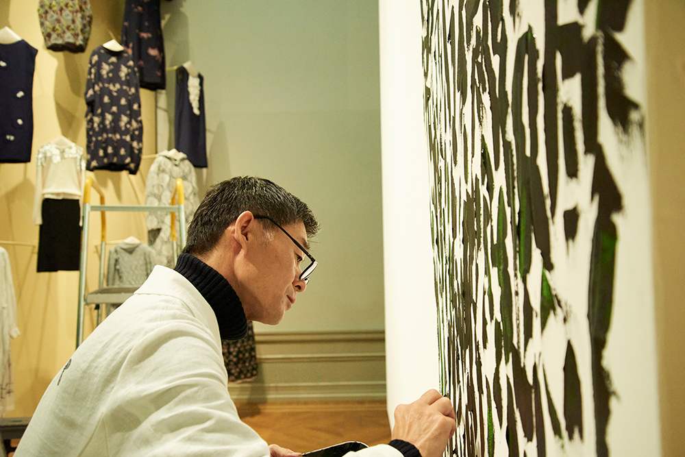 - 「DESIGN = MEMORY:Akira Minagawa & minä perhonen」の会場風景と会場内で壁画制作をしている皆川氏