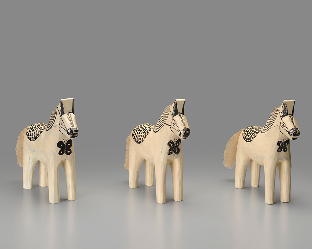 スウェーデンの「幸せを運ぶ馬」とされる伝統工芸品、ダーラナホース。今回、皆川氏が絵付けしたダーラナホースは、スウェーデン語で「平和」を意味する「fred(フレッド)」と名付けられました。東京会場では、fredが展覧会会場出口で皆様をお見送りいたします。